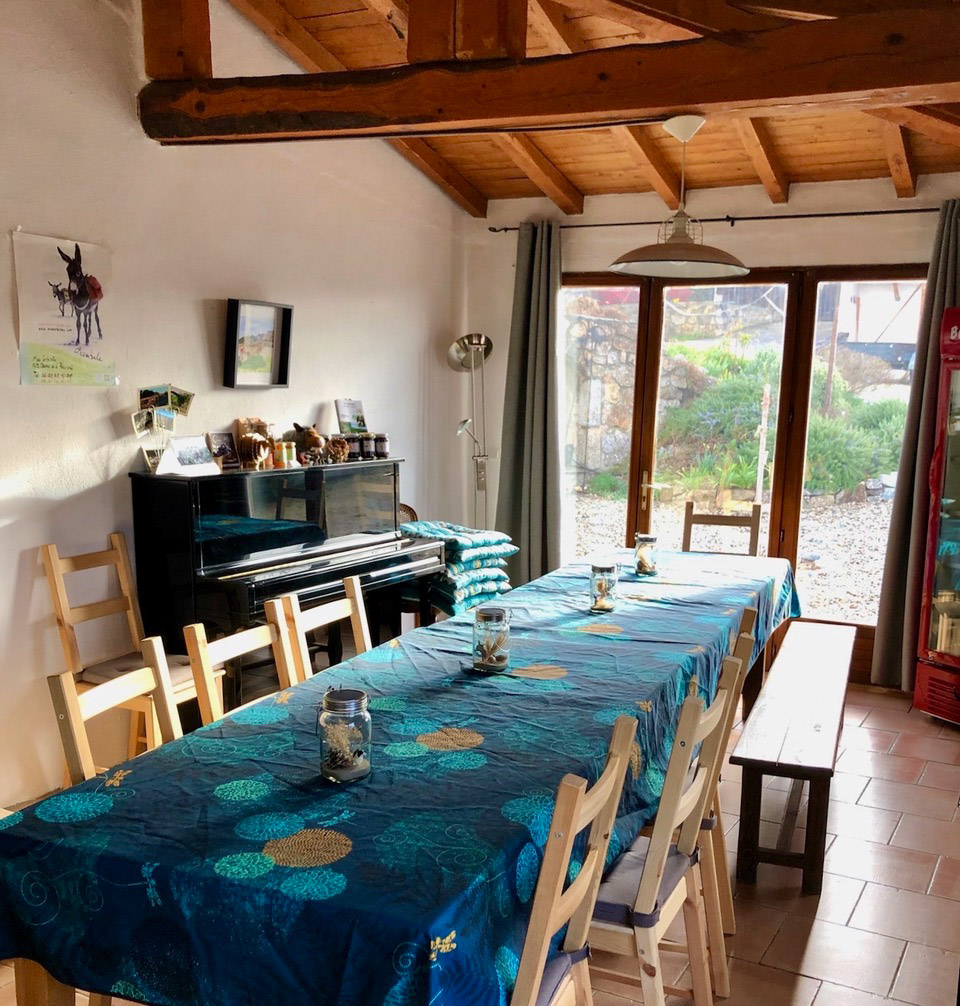 Die ehemalige Magnanerie, wo im 19. Jahrhundert Seidenraupen gezüchtet wurden, bietet allen Gästen ein großzügiges Kaminzimmer mit Aufenthaltsraum sowie einen Speisesaal, falls ausnahmsweise mal nicht die Sonne scheint. An sonnigen Tagen warten Frühstück und Abendessen am langen Tisch im Schatten der Pergola auf Euch.